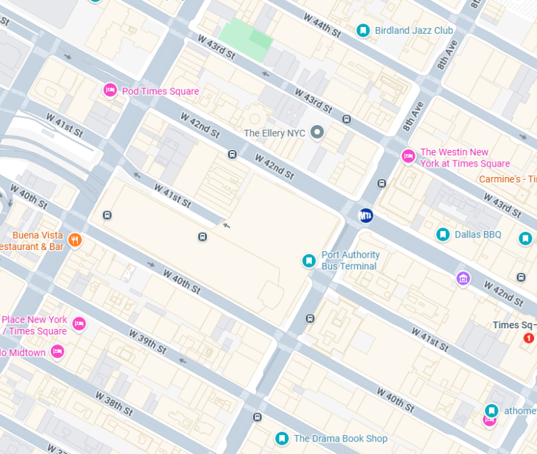 뉴저지 대부분 지역에서 뉴욕을 오갈 때 버스를 타고 내리려면 이 터미널을 찾으면 된다. 뉴욕 북부로 가는 버스도 여기 대부분 있다. 42번가와 40번가, 그리고 8th, 9th avenue 사이에 걸쳐 있는 꽤나 큰 건물이다. 42번가쪽에도 출입구가 있고, 8번가쪽에도 출입구가 있다. 지하로는 MTA와 연결되어있는데, 꽤나 구불구불 한참을 가야한다는 점. 무턱대고 MTA사인만 보고 지하로 들어간 적이 있는데, 오히려 멀고 길을 잃을 것 같은데, 공기가 너무 안좋아서 힘들었고 지상으로 다니는 게 훨씬 나았다.