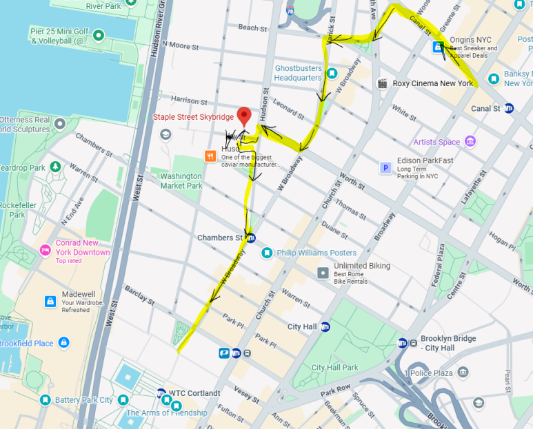 소호에서 나는 걸어내려갔는데, 거리가 꽤 된다. 지하철이나 버스 타기를 추천하는 거리다. 첫 번째 주말에 뉴욕에 처음 간 거라 걸으면서 지리를 익히려는 것도 있었지만, 가는 길에 트라이베카 Tribeca 구역에서 Staples street skybridge를 보려는 것도 한 가지 이유였다.