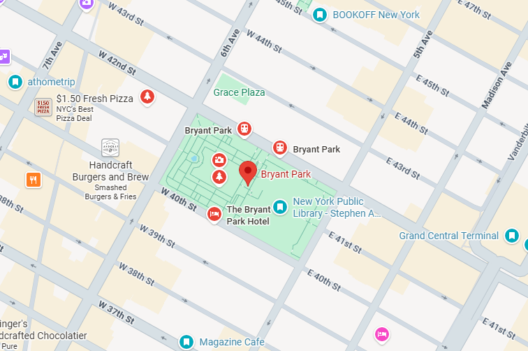 그 중에서 가운데, 40번가와 42번가(동서방향) 사이, 그리고 5번과 6번대로(남북방향) 사이의 구역에 브라이언트 파크가 있다.