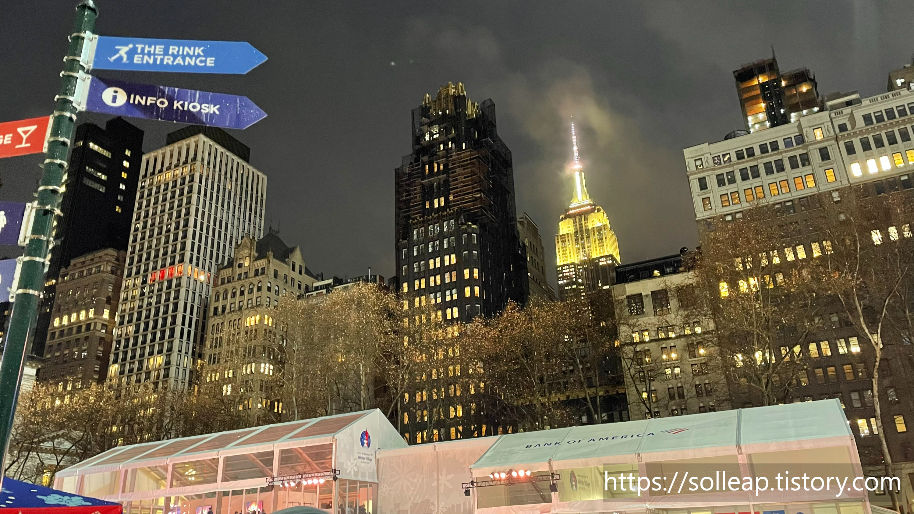브라이언트 파크에는 지하철역 출입구도 있고, 바로 앞에 홀푸즈 마켓도 있다. 미드타운에서 방향을 찾을 때 중심이 될 수 있는 곳이다. 그리고, 남쪽 방향으로 엠파이어스테이트 빌딩이 보여서 밤에 조명이 켜지면 꽤 멋지다.